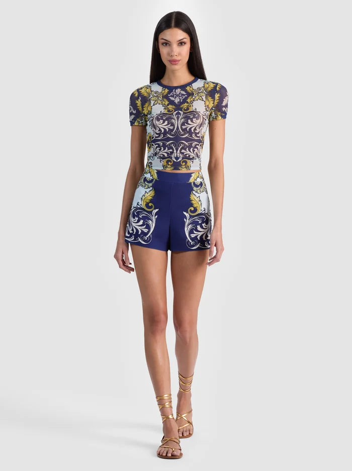 Meet your not-so-basic basic. The Tess printed t-shirt is the piece you’ll reach for on repeat--fitted, flattering, and crafted from our printed mesh that feels perfect for going out. With a classic crew neckline and cropped cut, it hugs in all the right places without feeling too tight. Wear it solo with denim or layer it under blazers, cardigans, you get the deal--it does it all.