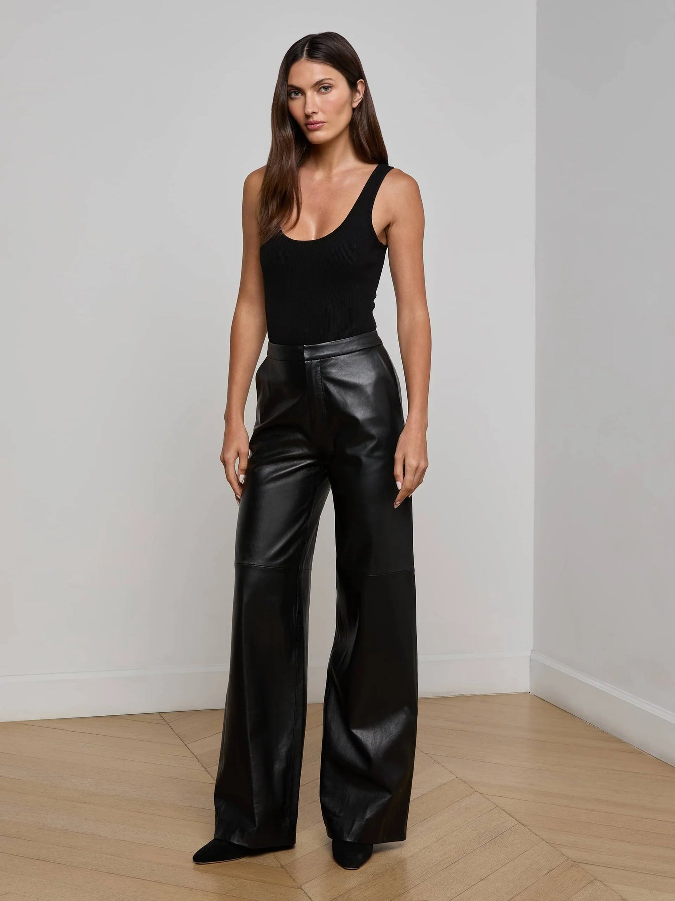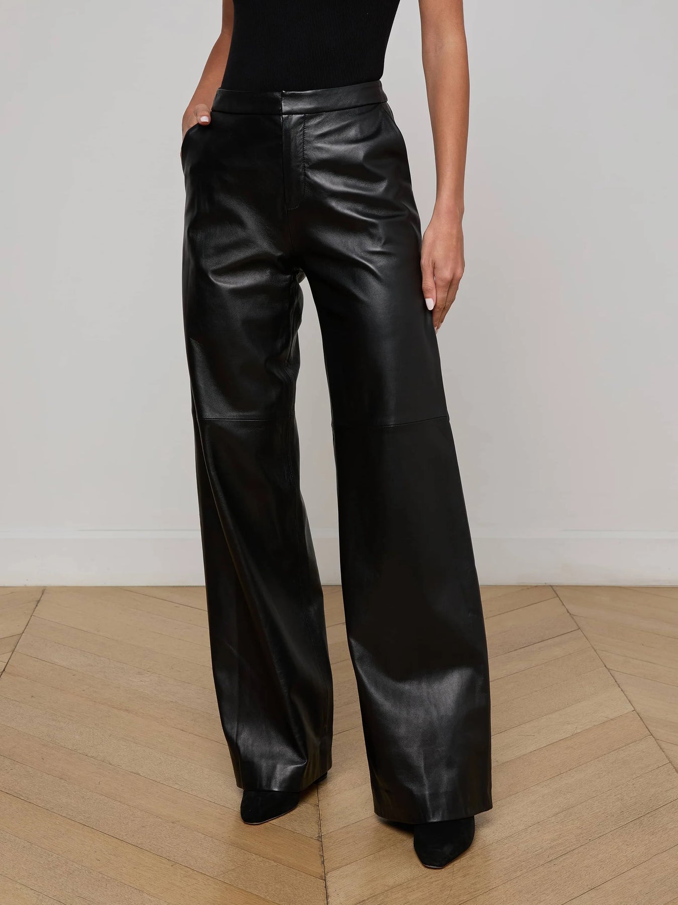 A luxe straight-leg trouser in black lambskin leather. Supple premium-leather hugs from contoured waistband to upper thigh, then releases into a full straight leg. Includes front slant and back welt pockets. With zip fly and hidden hook-and-bar closures. Fully lined. 100% Leather.