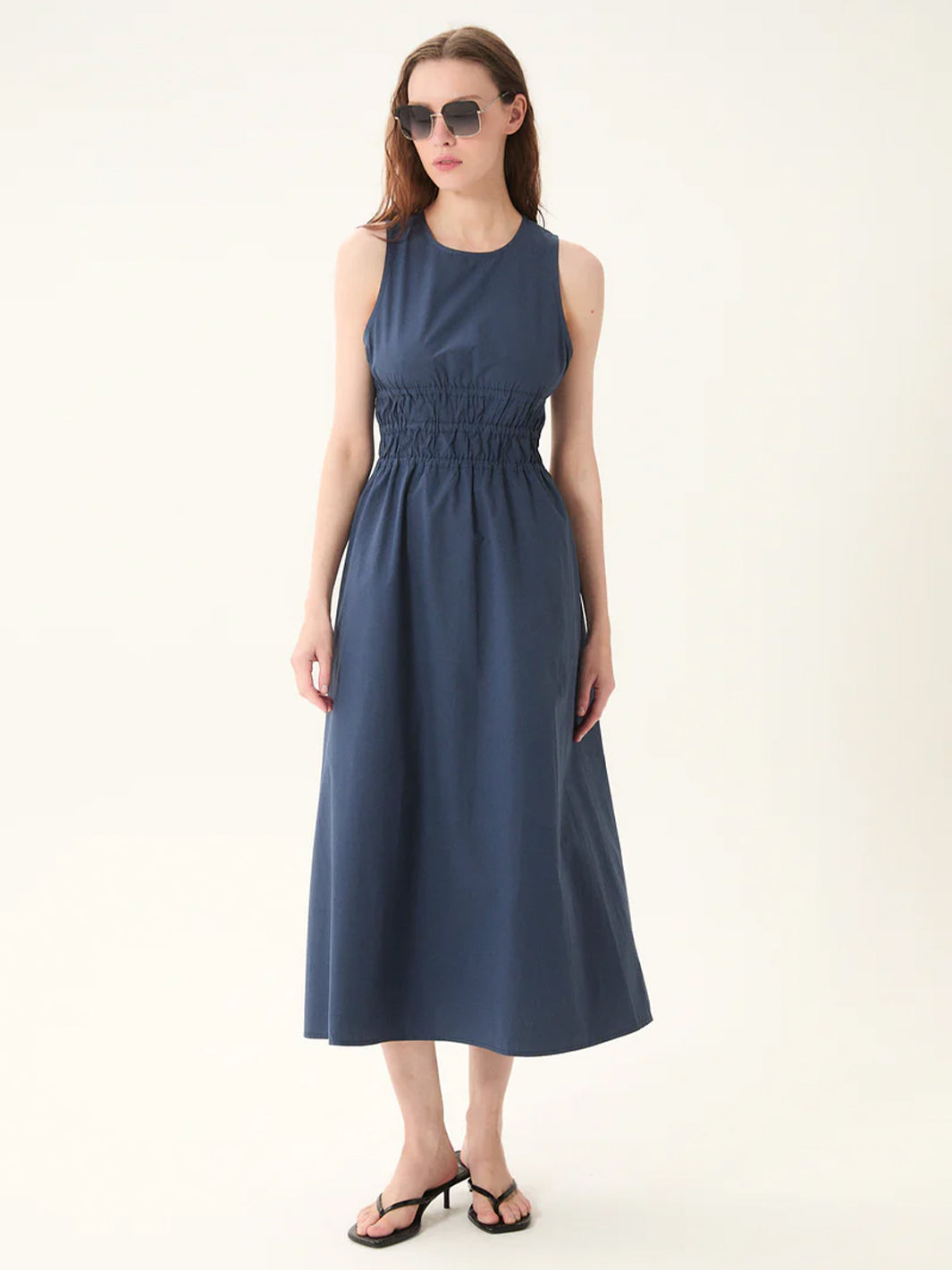 Sleeveless poplin dress with a round neckline. Designed with side pockets and elasticated panels at the waist and under the bust for a comfortable fit. Features a back slit with button closure. Midi length.