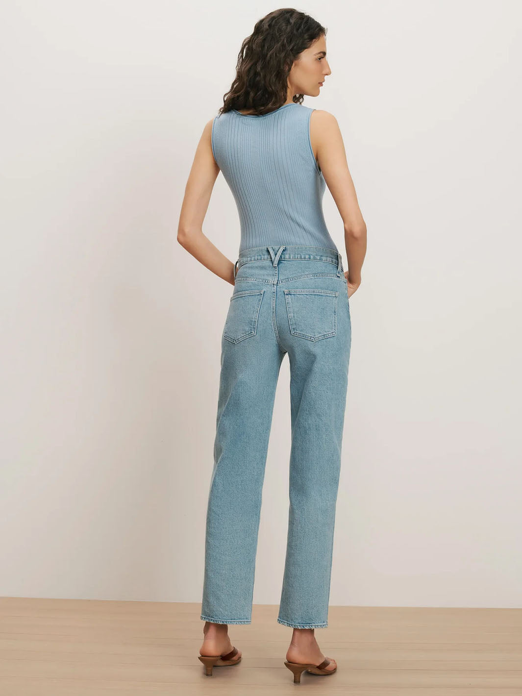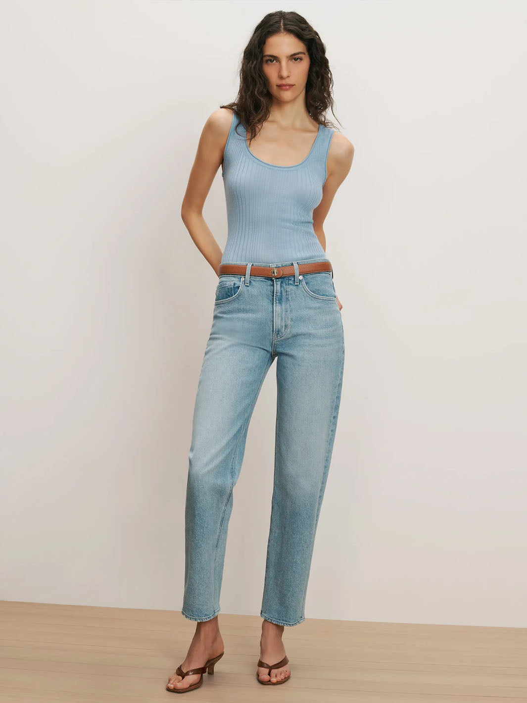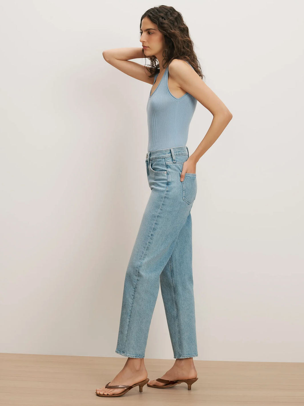 The arc jean—perfected. Expertly crafted in LA from Italian stretch denim, the Harley features a cropped barrel leg with curved side seams for a modern bowed silhouette. A high-rise waist and a relaxed, tapered cut create a flattering shape—plus, it's pre-shrunk to hold the fit. Pair this light-blue jean with ballet flats for everyday and heels for added polish.