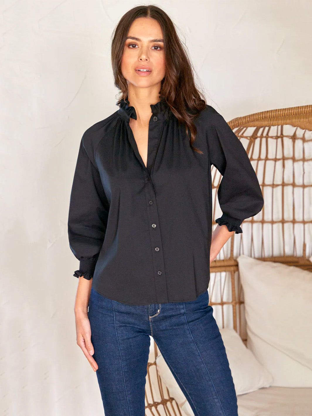• Finley "Fiona" ruched silky black poplin shirt with ruffle trim along the neckline