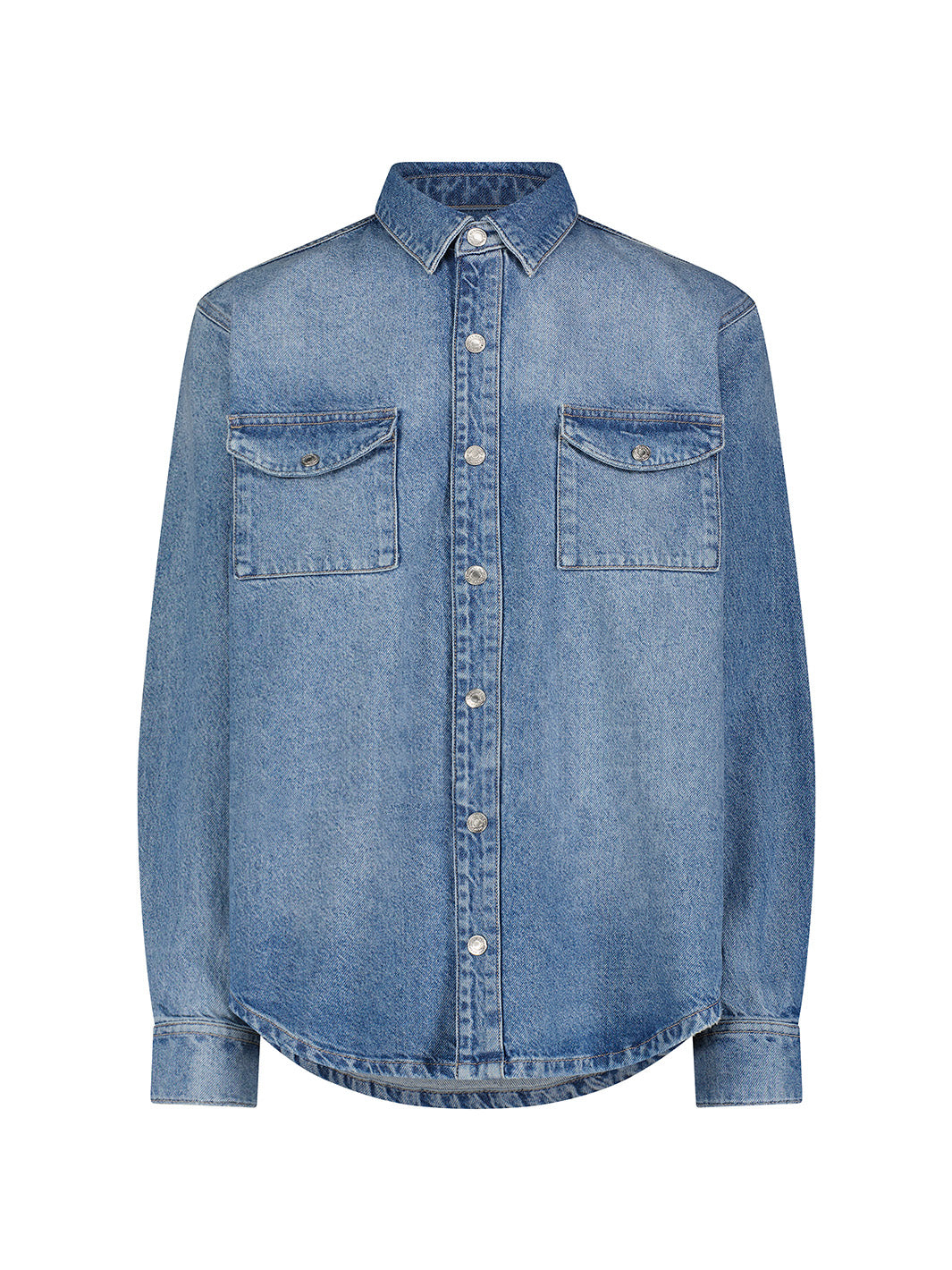 SMO is a classic denim shirt with a relaxed fit, pointed collar and center front opening. Silverado is a light indigo wash with vintage character throughout. It features silver snaps and subtle grinding at the pockets and hem.