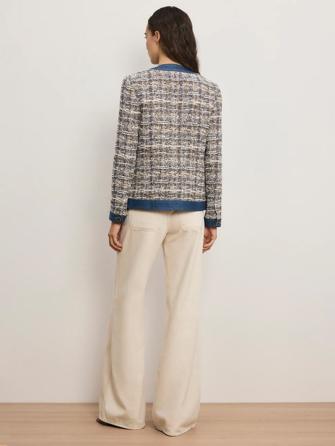 Crafted from luxe Italian tweed in off-white, the Ainslie collarless jacket features a boxy, mid-length silhouette. Designed with a full button-down placket, it’s finished with denim-covered, gold-rimmed buttons, a contrast denim trim, and four front flap pockets. A utilitarian take on the lady jacket, this tweed jacket pairs effortlessly with wide-leg denim and strappy heels.
