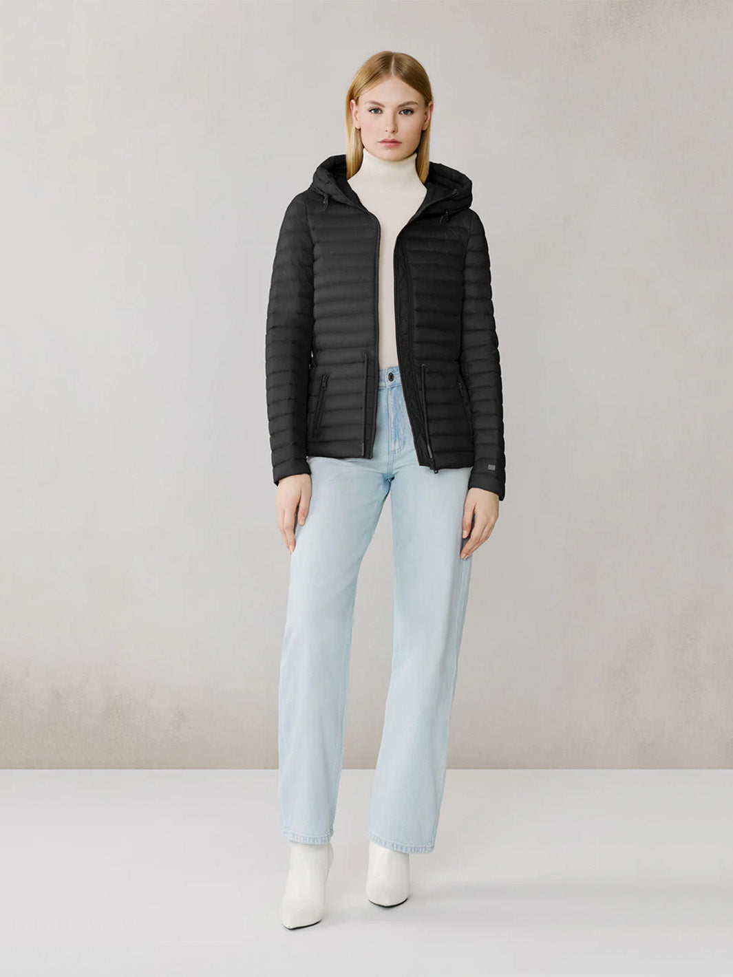 AYLEEN by SOIA & KYO is a lightweight down jacket built for on-the-go warmth. Made from 100% recycled nylon and filled with RDS-certified down, it packs neatly into its own carrying bag. The cinched waist flatters your shape, while water resistance and a +5 °C rating make it perfect for transitional temps.