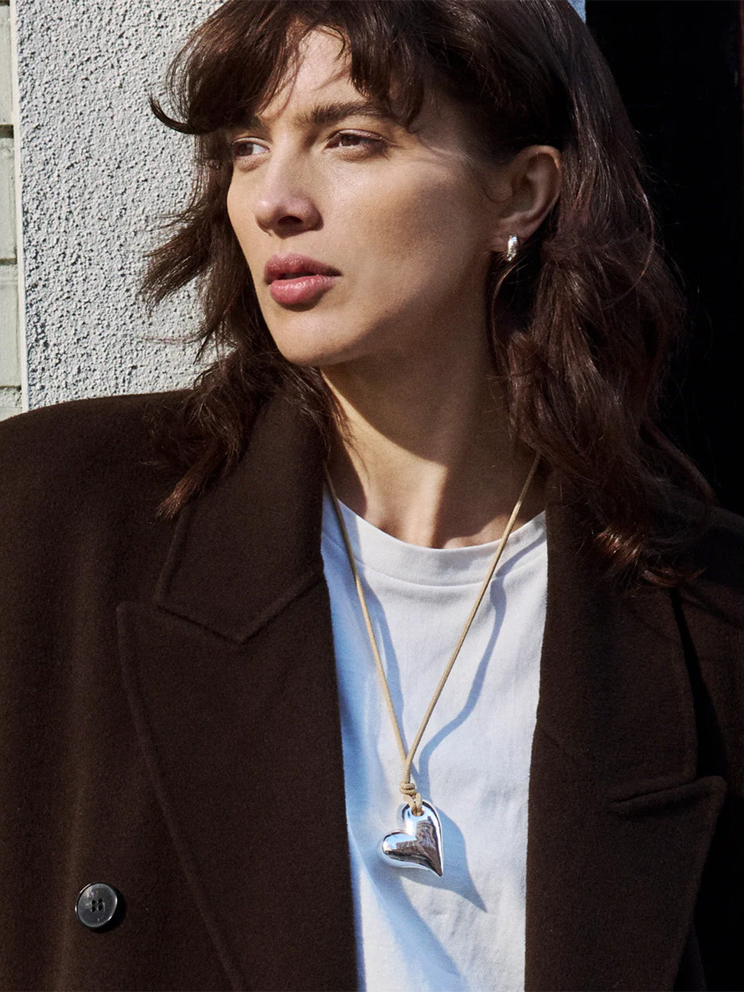This voluminous silver heart pendant hangs from an adjustable beige cord made of recycled polyester. Finished in high-polish silver.