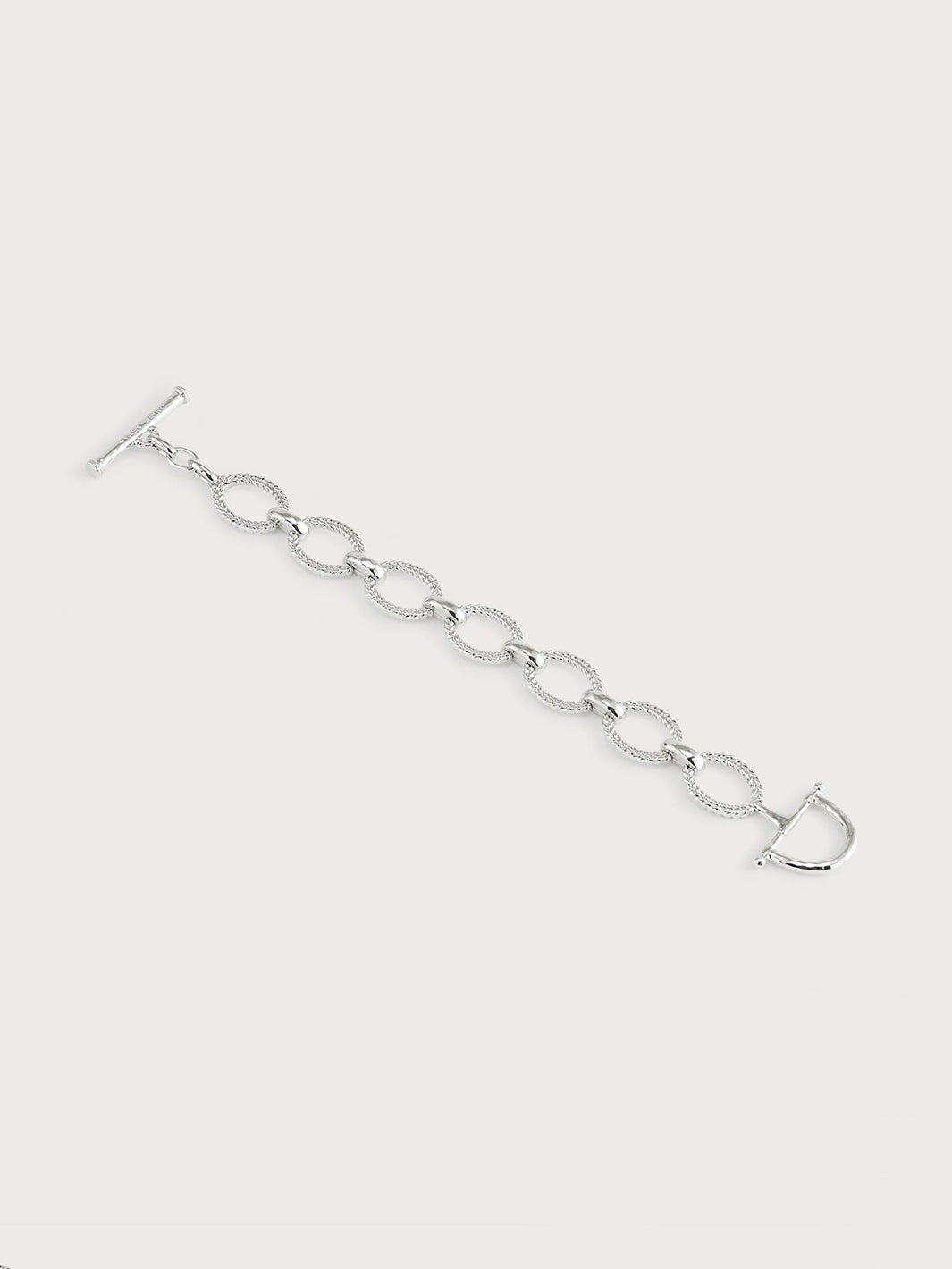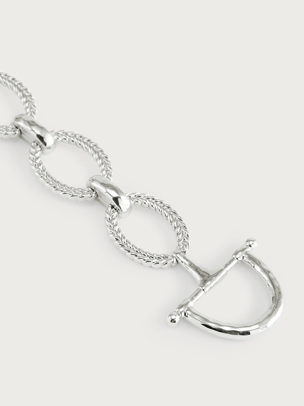 The Cheval Chain Bracelet captures the artistry of hand-braided reins in Sterling Silver Plated Brass links that catch the light with every movement. An equestrian-inspired horse bit clasp serves as both functional hardware and sculptural detail, nodding to the collection's heritage. This refined piece brings timeless stable elegance to your everyday or evening look.