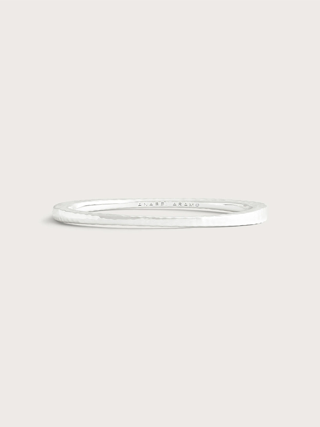 Effortlessly elevate your style with Anabel Aram's Farrier Thin Hinged Bangle in sterling silver plated brass. The timeless and classic design is perfect for the modern, minimalist fashionista. The hammered detailing adds a touch of chic to any outfit. Embrace the effortless elegance of the Farrier thin hinged bangle.