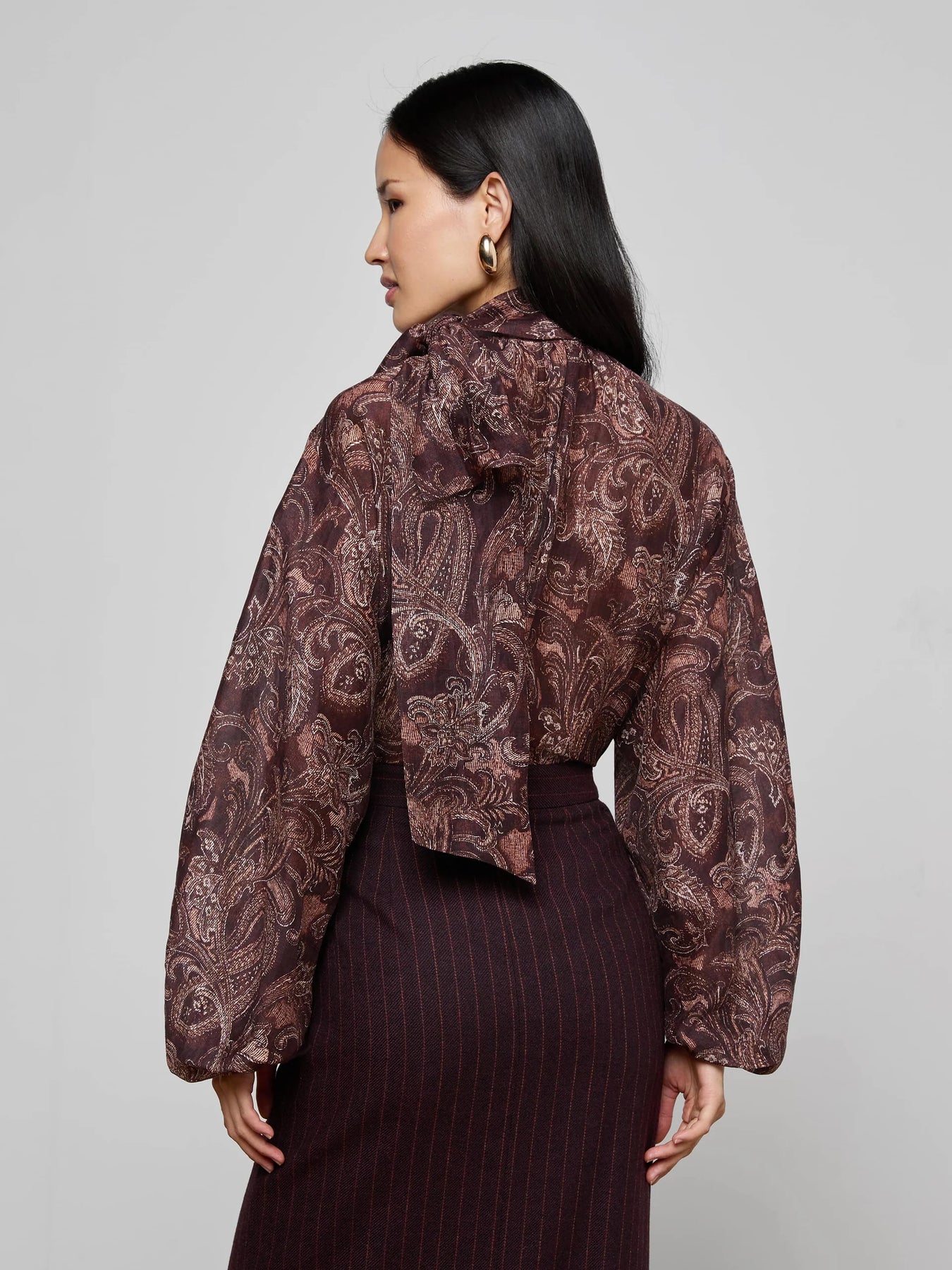 Oversized and airy, the Rhett blouse encapsulates bohemian romance finished with flowy bell sleeves and a scarf neck tie. Crafted in a lightweight blend of linen and silk with a slub texture, it’s easy to wear and style—perfect when paired with slim jeans and sky-high heels for a balanced look. Now back in brown with an etched paisley print.