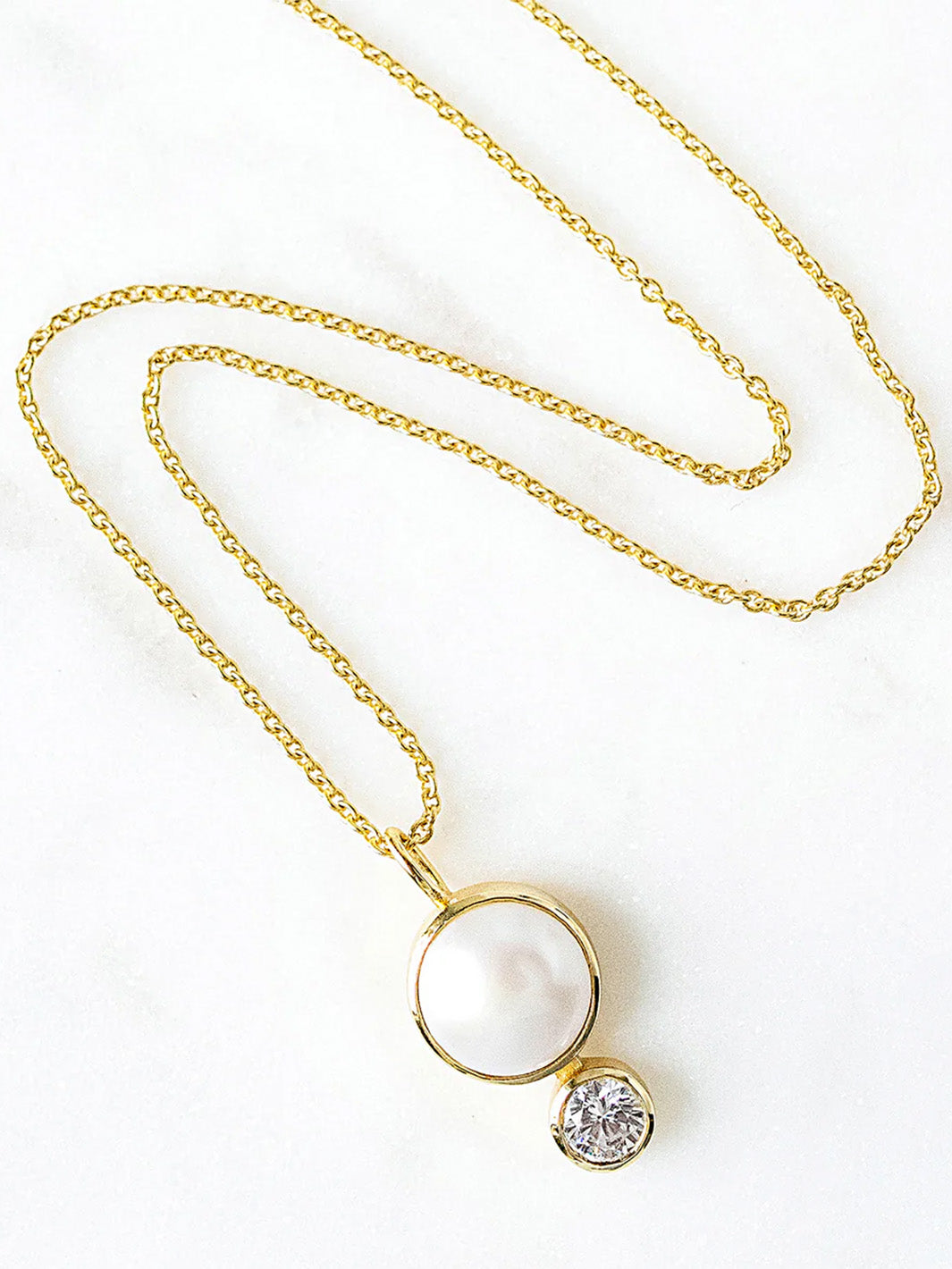 Meet the Tini Mini Pendant Necklace in Pearl — a delicate balance of modern minimalism and timeless elegance. Featuring striking black onyx paired with a sparkling bezel-set cubic zirconia, this lightweight pendant adds just the right amount of shine whether worn solo or layered. Effortless, chic, and designed for everyday wear.