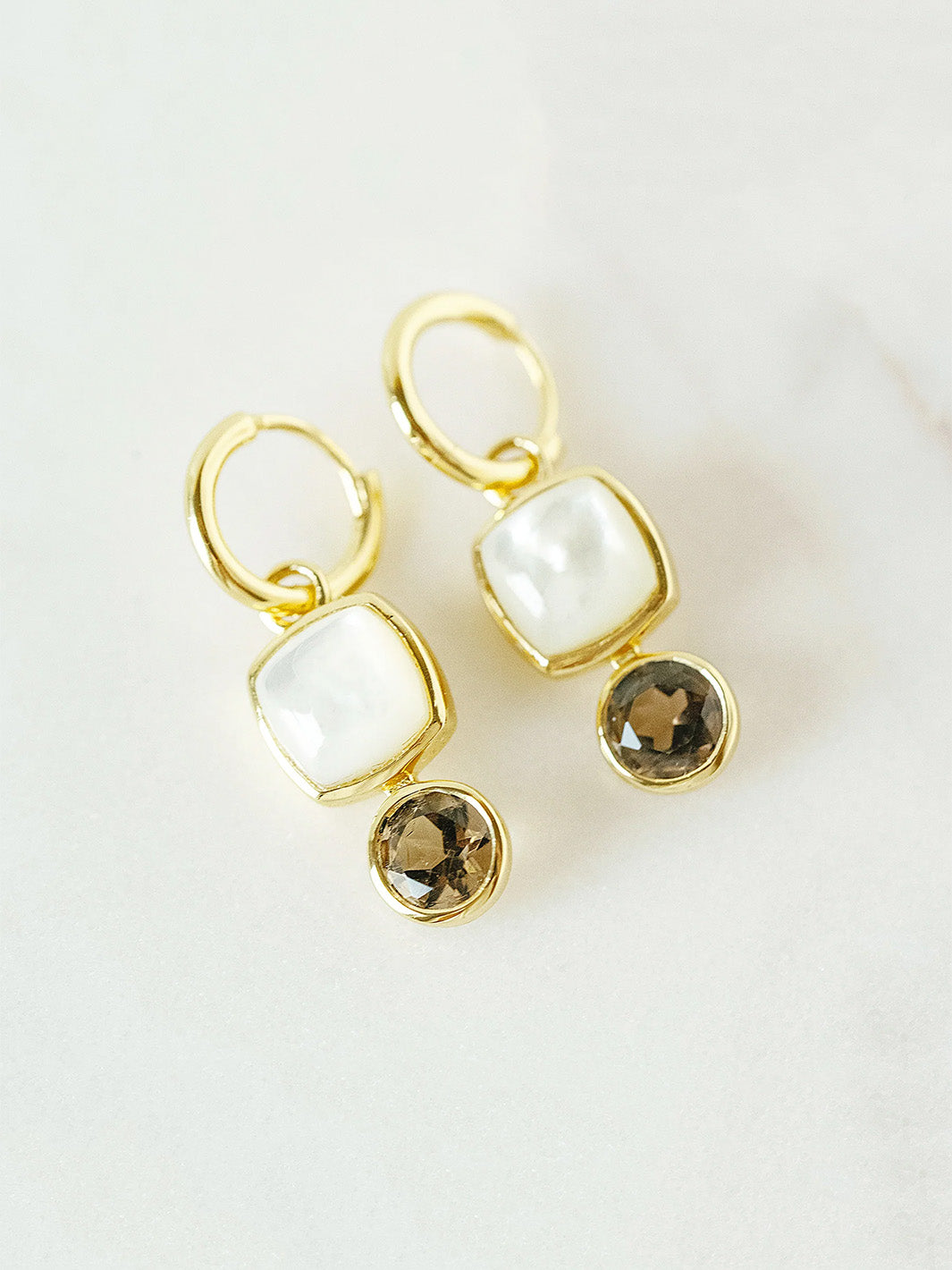 Color Block Charm Huggie Hoop Earrings in Mother of Pearl and Faceted Smoky Quartz