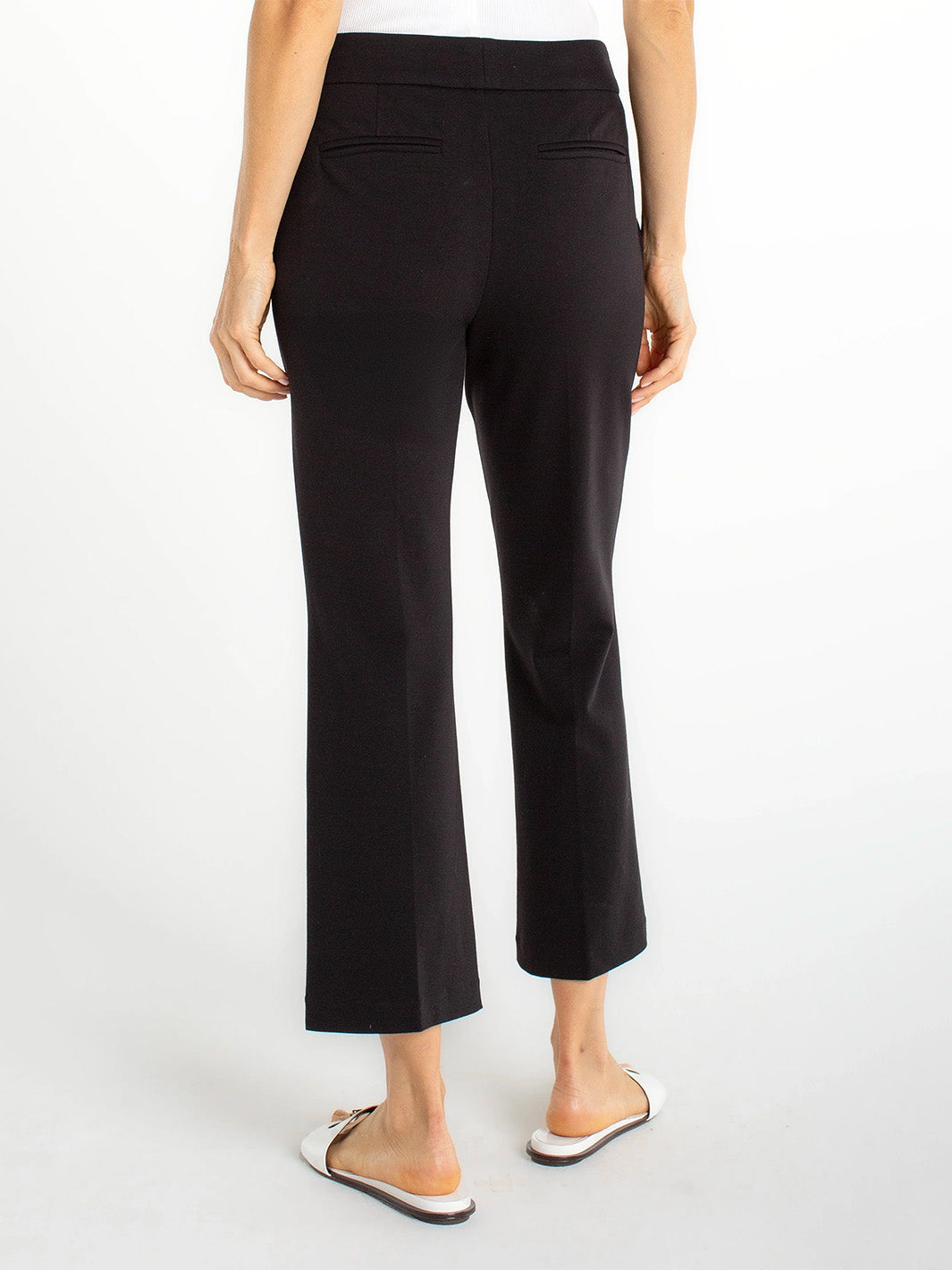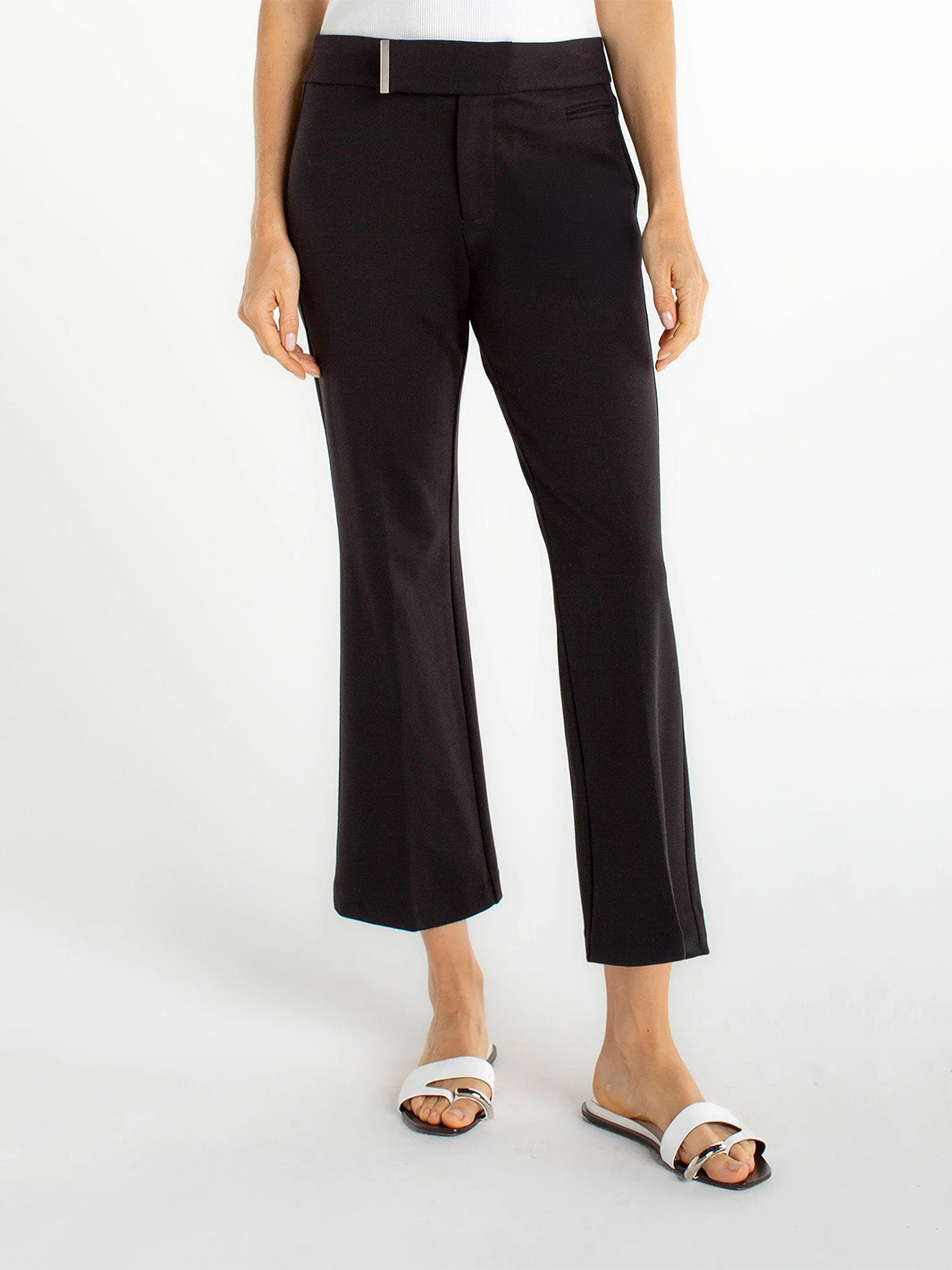 This crop flare offers a fresh take on a classic silhouette. A subtle flare at the hem creates an easy, flattering shape, while the extended tab waistband adds a tailored touch that feels modern and refined. It is an effortless piece that pairs just as well with soft blouses as it does with fitted knits.
