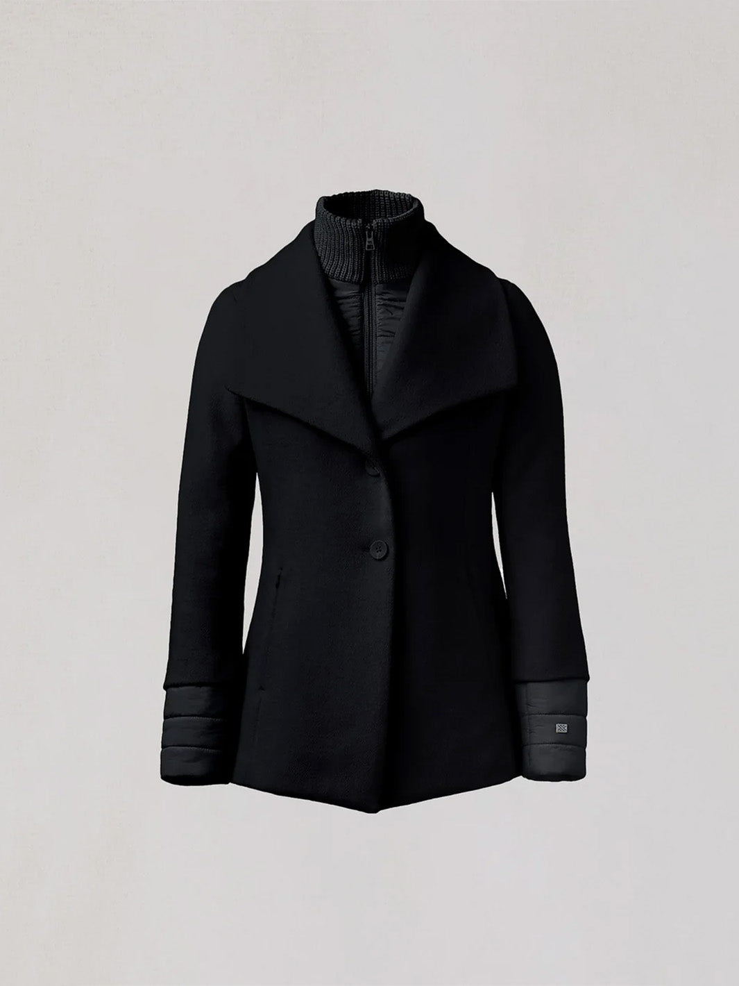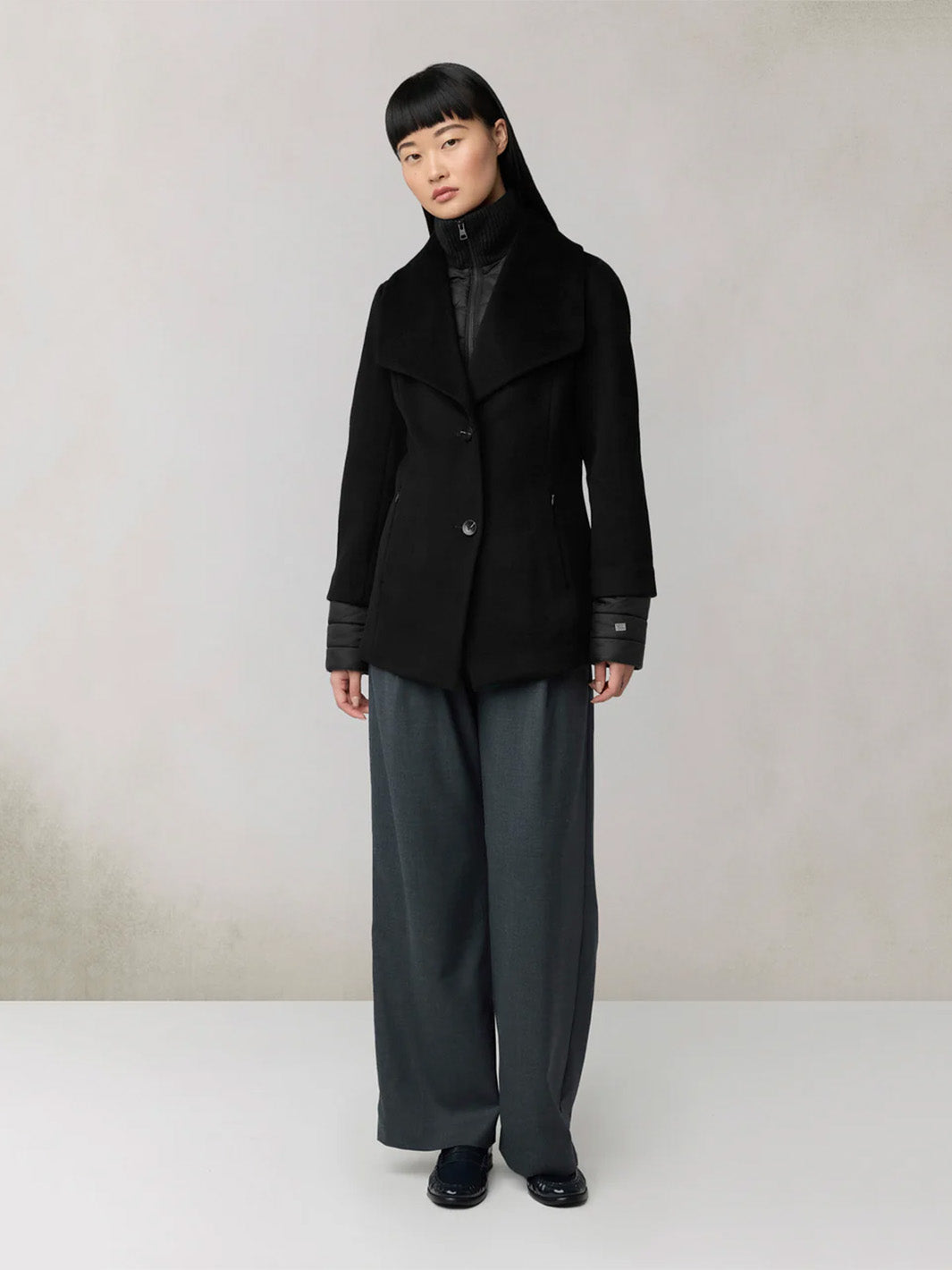 FRIEDA by SOIA & KYO is a slim-fitting wool coat with thoughtful layers. A detachable bib with ribbed knit collar and puffer cuffs offer extra warmth and dimension. Button closure and invisible zip pockets keep it classic and clean.