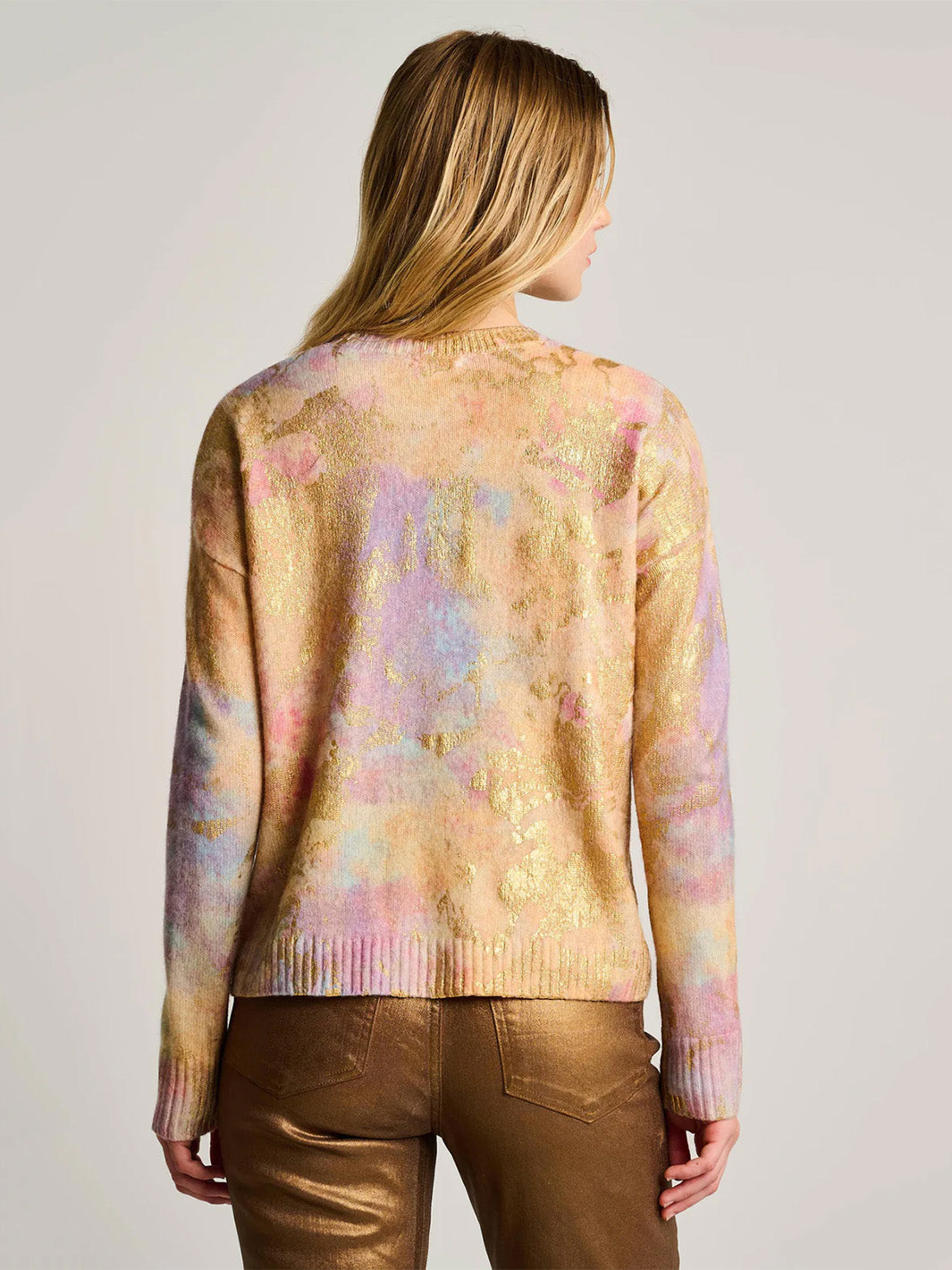 A luxe layer that catches the light in all the right ways. Spun from a refined merino-cotton blend, this relaxed crewneck is finished with soft drop shoulders and a multicolor cloud print laced with subtle metallic threads—an artful balance of style and radiance.