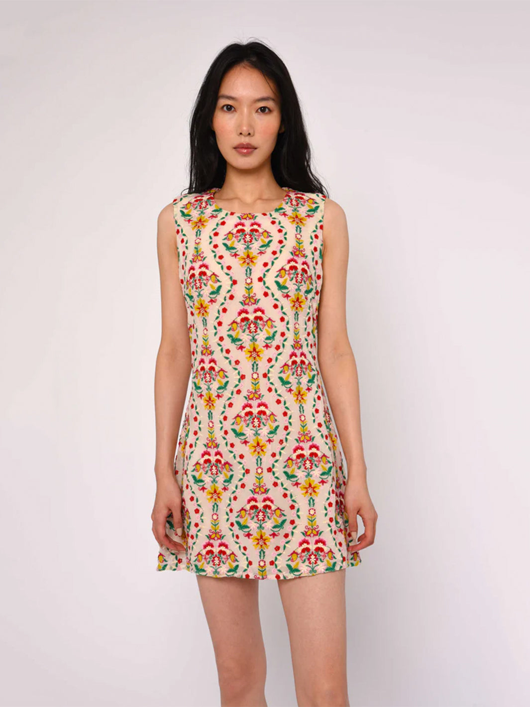 Introducing a classic shift dress for Spring 2026: the Tiffany Dress. What makes this dress special is the multi-colored floral embroidery that runs throughout, paired with a center-back zipper for easy on-and-off wear.