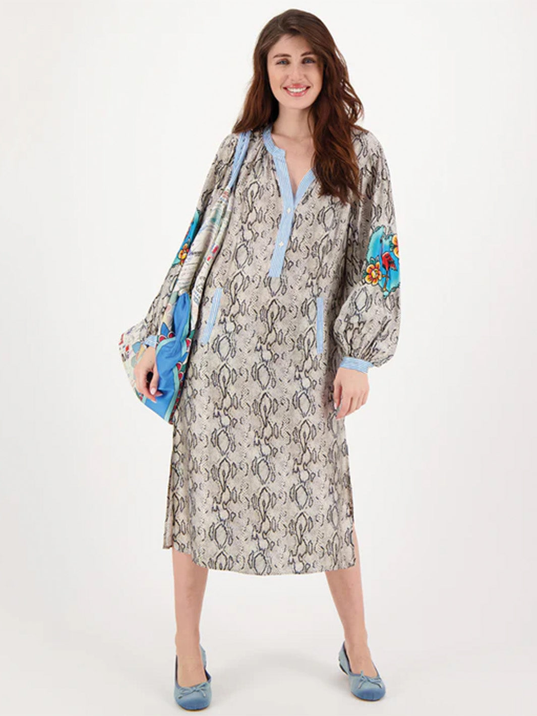 Mid length long sleeve placket dress with side slits in our Snake Charmer print. Placket has a V-neck and is long. Matching pocket flaps and cuffs all in blue. Body of the dress and sleeves are in a grey snakeskin print. Sleeves have a flamingo graphic in a blue heart. Feminine, easy to wear look.