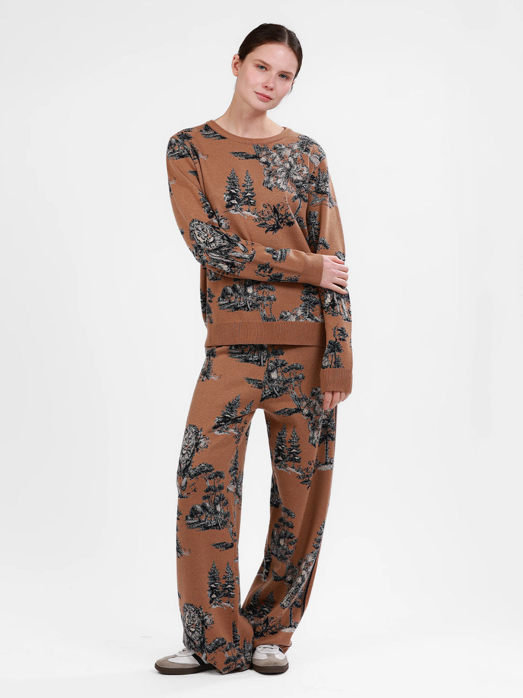 A jacquard knit sweater featuring our iconic landscape print in earthy tones. Showcasing pine trees and majestic lions in black and cream, it’s perfect paired with the matching pants for a statement look.