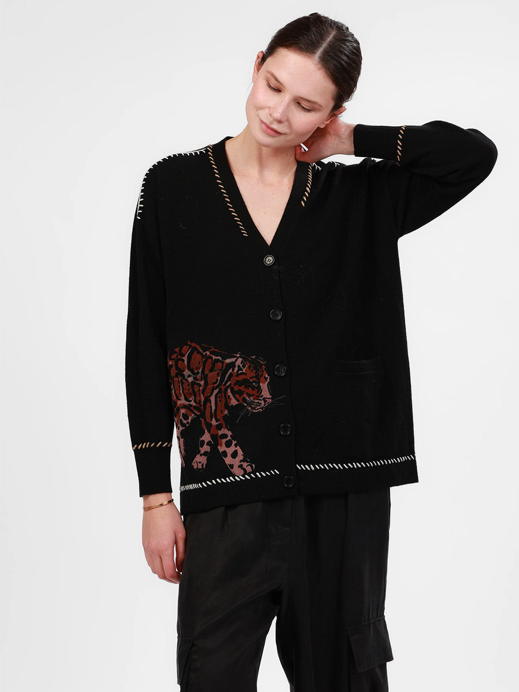 A wool and cashmere blend cardigan in black with contrast stitching in beige and white. A brown-toned leopard strolls across one of the front pockets. A winter staple with a Las Sureñas twist—elegant, cozy, and always on point.