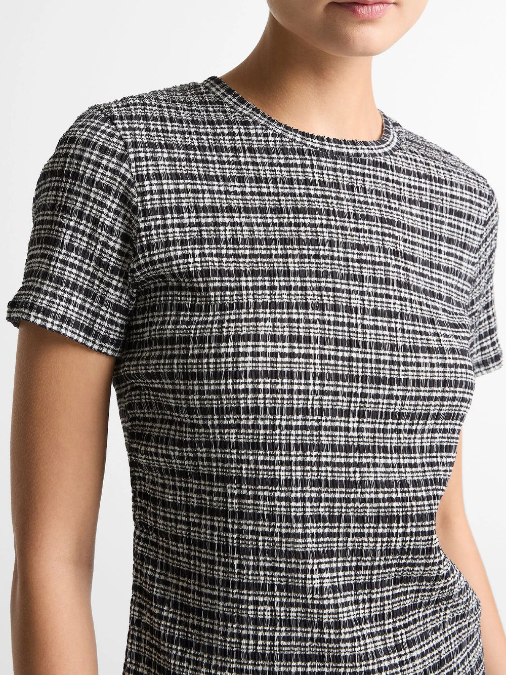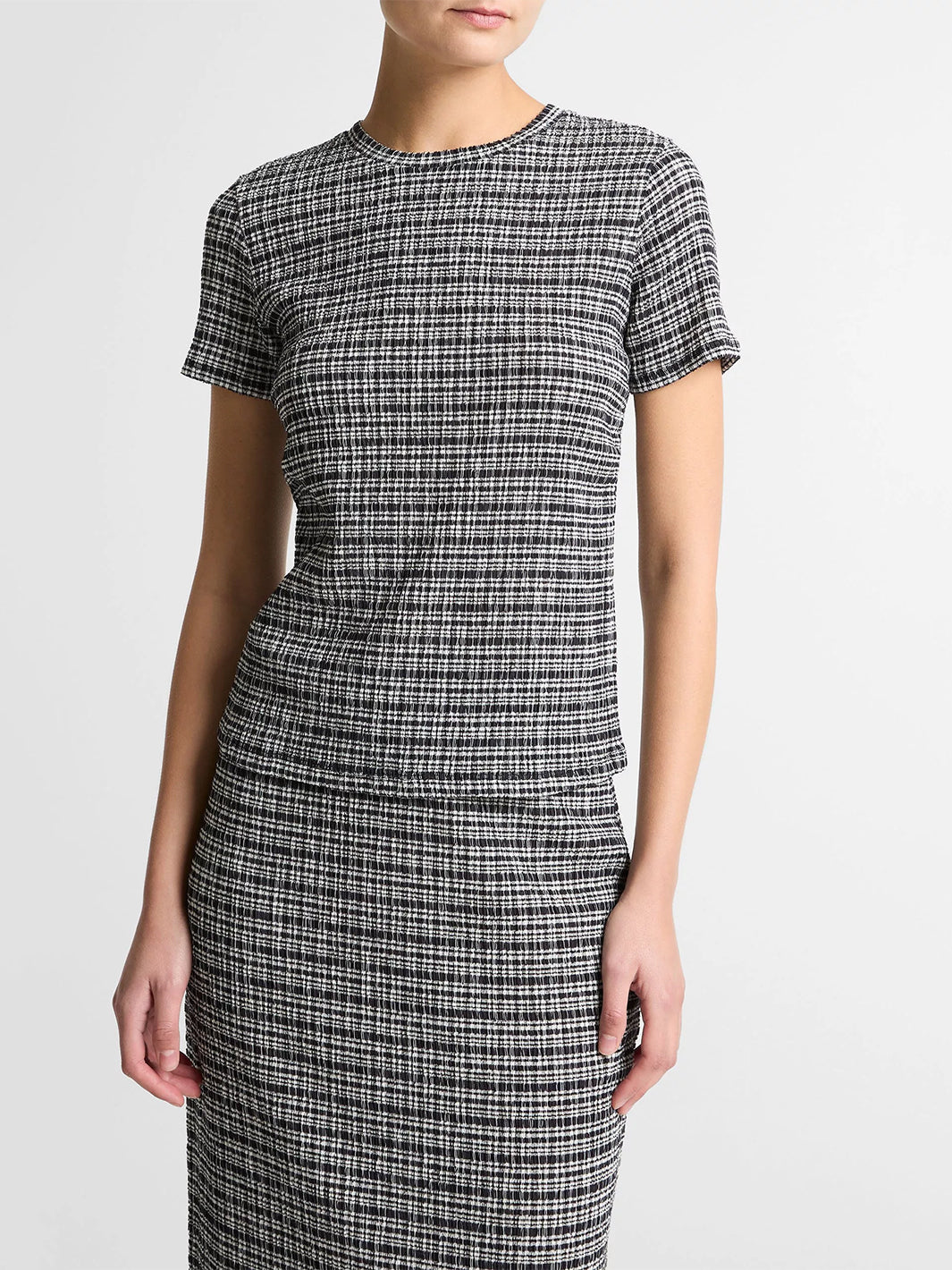Plaid Grid-Knit Short-Sleeve Crew Neck Top in Eclipse Combo