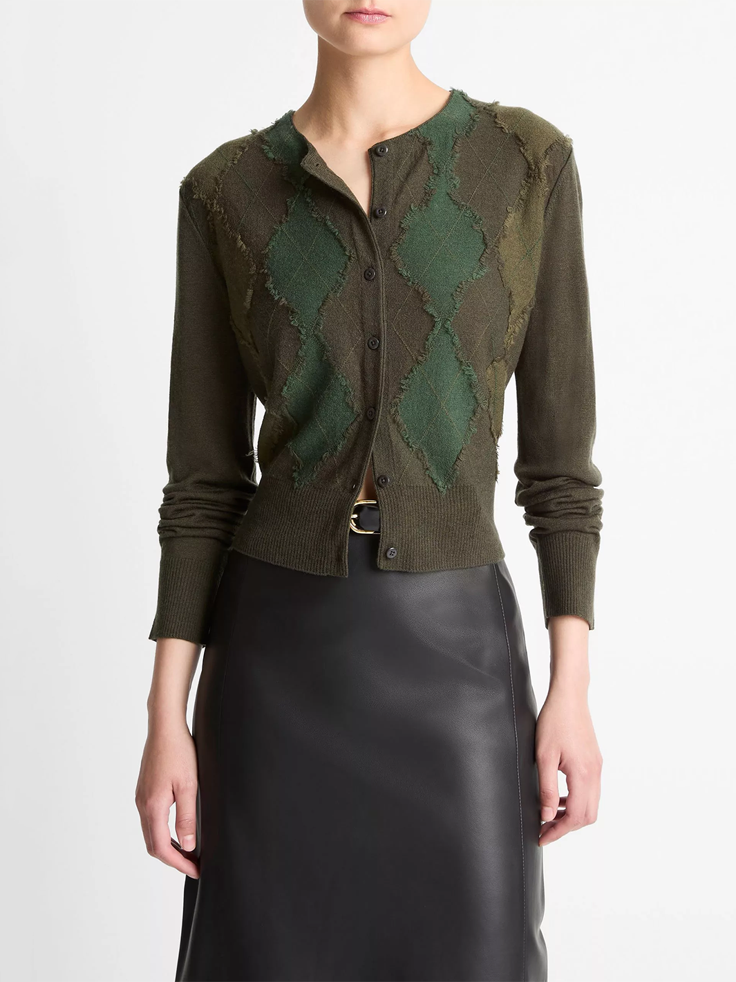 Hand-Cut Argyle Wool-Blend Cardigan in Verde
