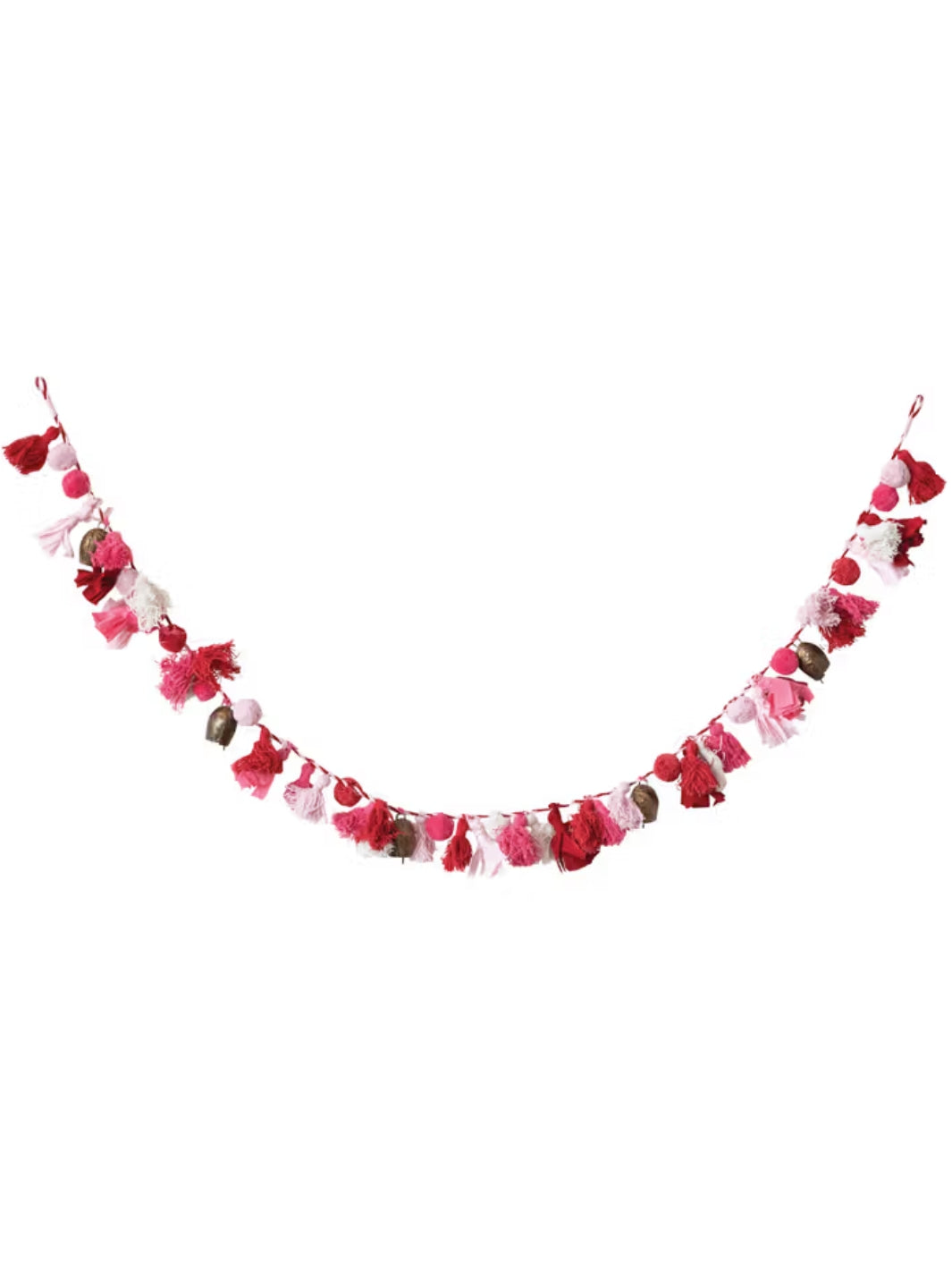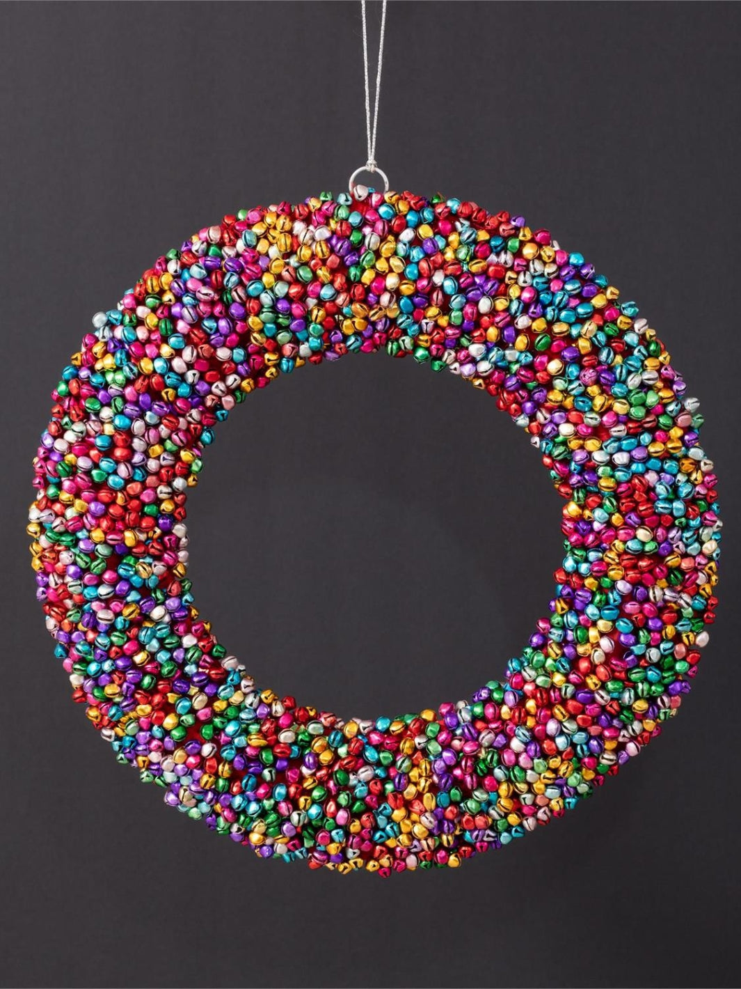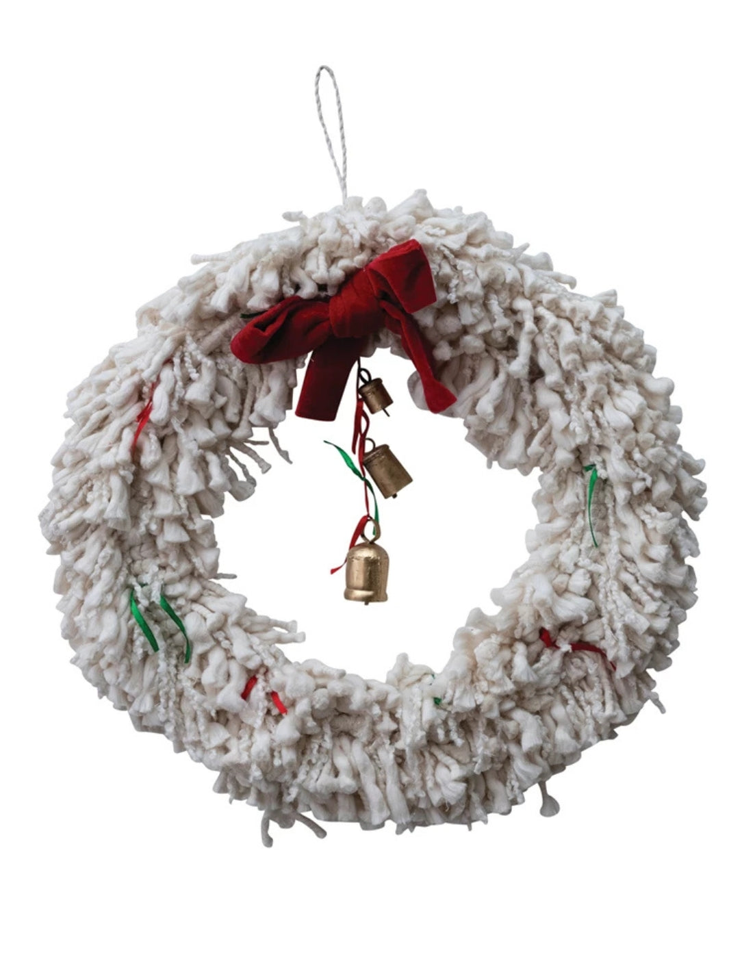 Handmade Cotton Blend Yarn Wreath with Red Bow, Ribbons & Metal Bells