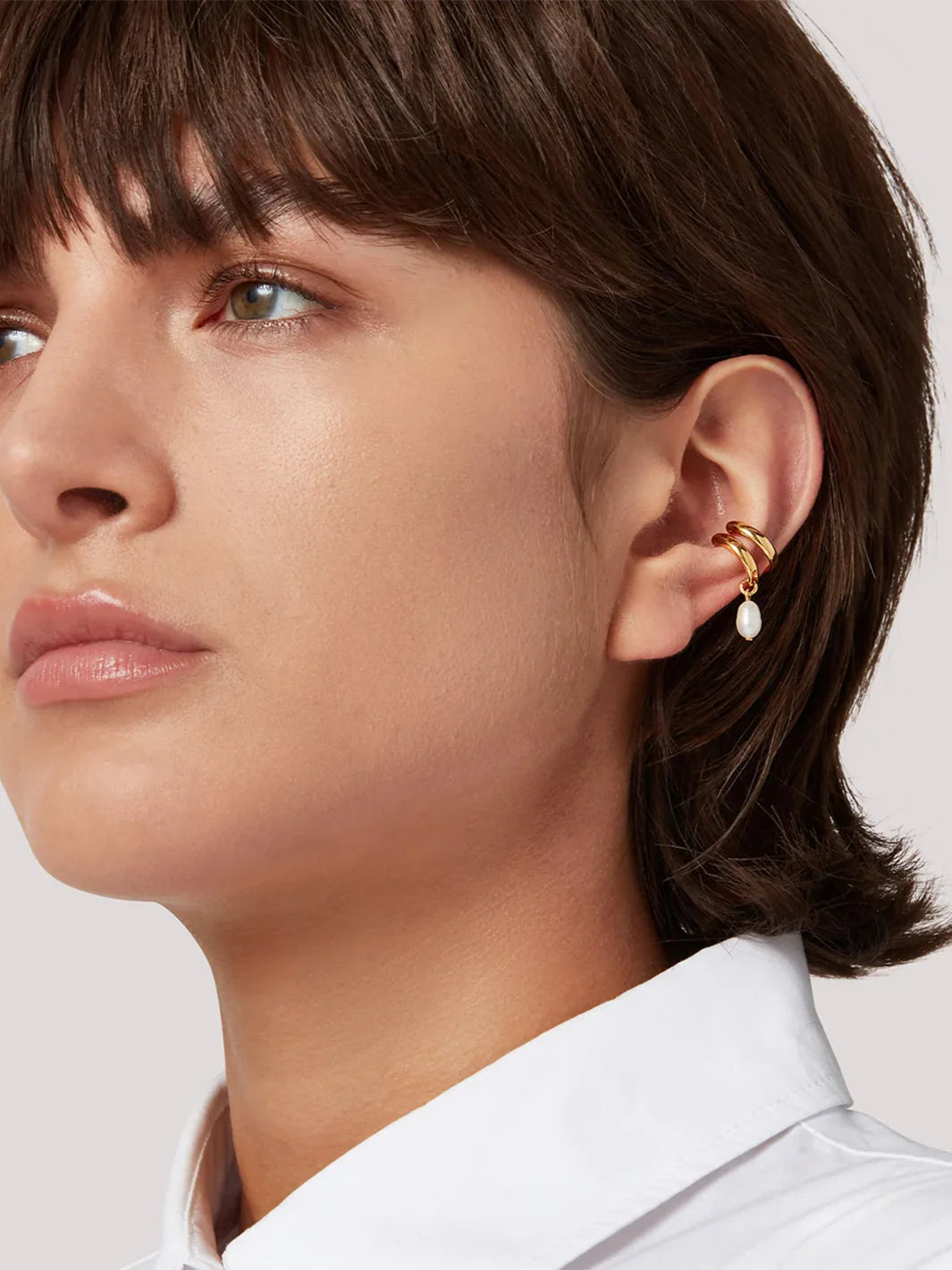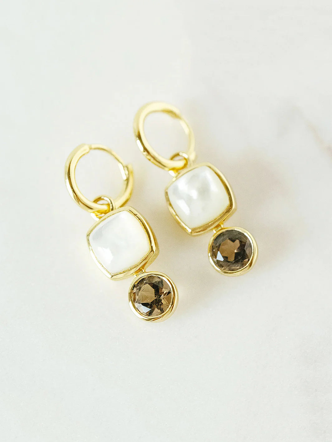 LAURA FOOTE DESIGNS Color Block Huggie Hoop Earrings in Mother of Pearl & Faceted Smoky Quartz
